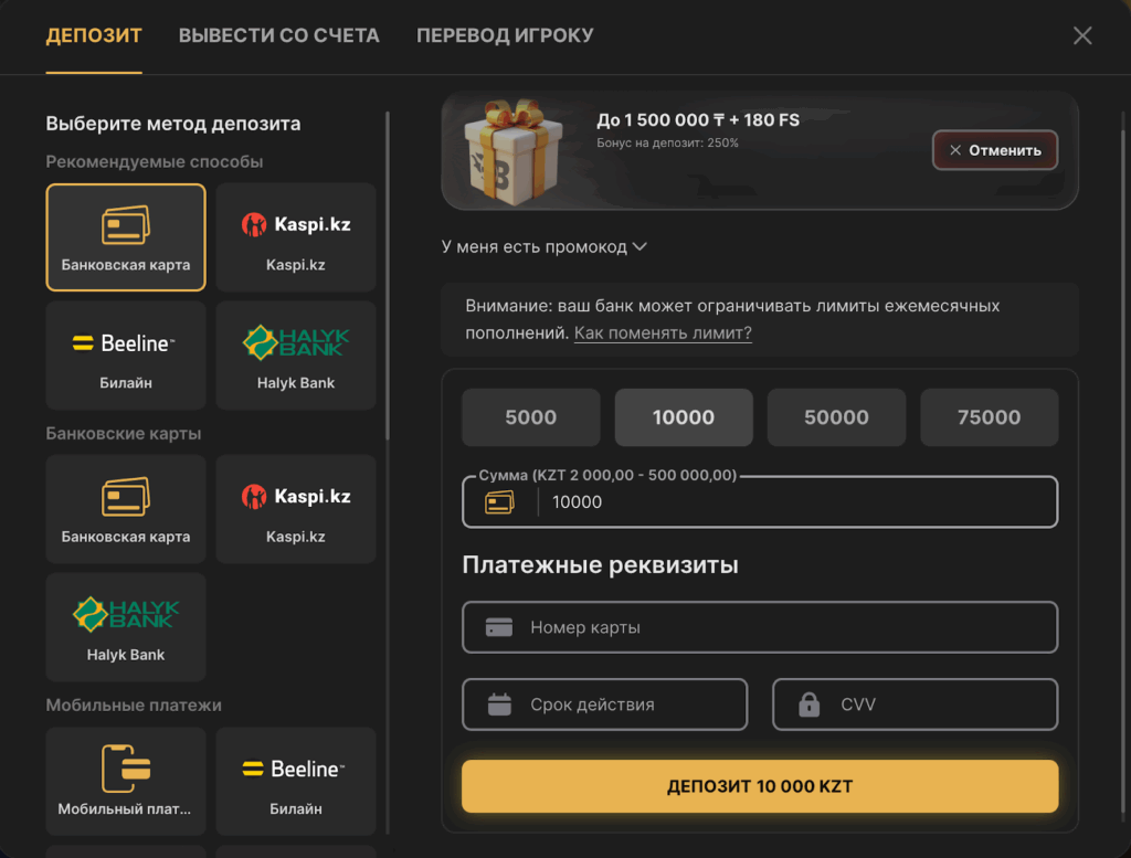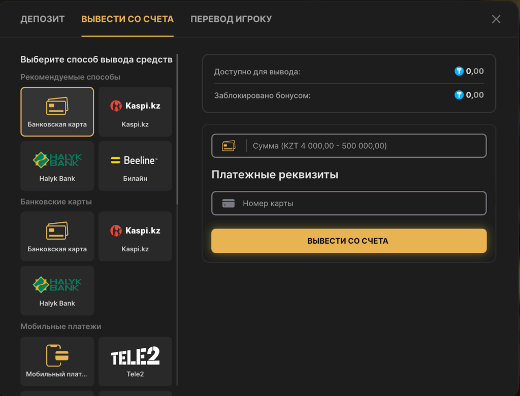 Минимальный депозит — 2 000 KZT, минимальный вывод — 4 000 KZT. Депозиты зачисляются мгновенно, выводы обрабатываются до суток, зачисление зависит от банка или сети.